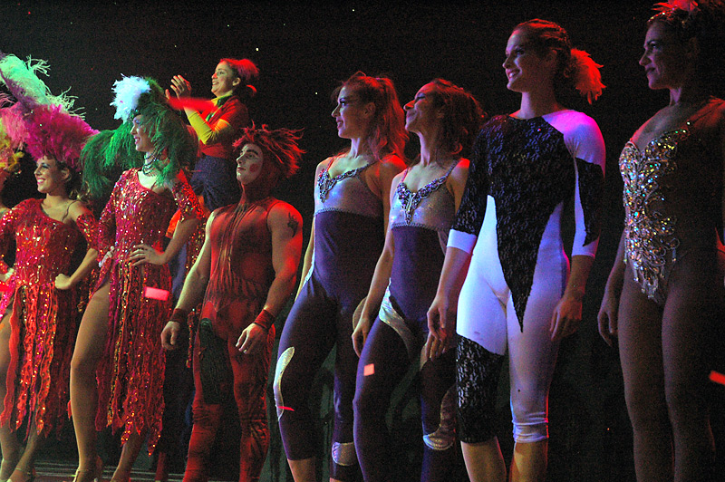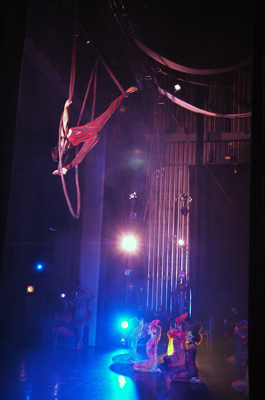 I took a few pictures from the wings on stage-left during the early show, and then more pictures from the balcony during the late show. You can see a mix of my pictures of the Cirque Le Masque show after this: